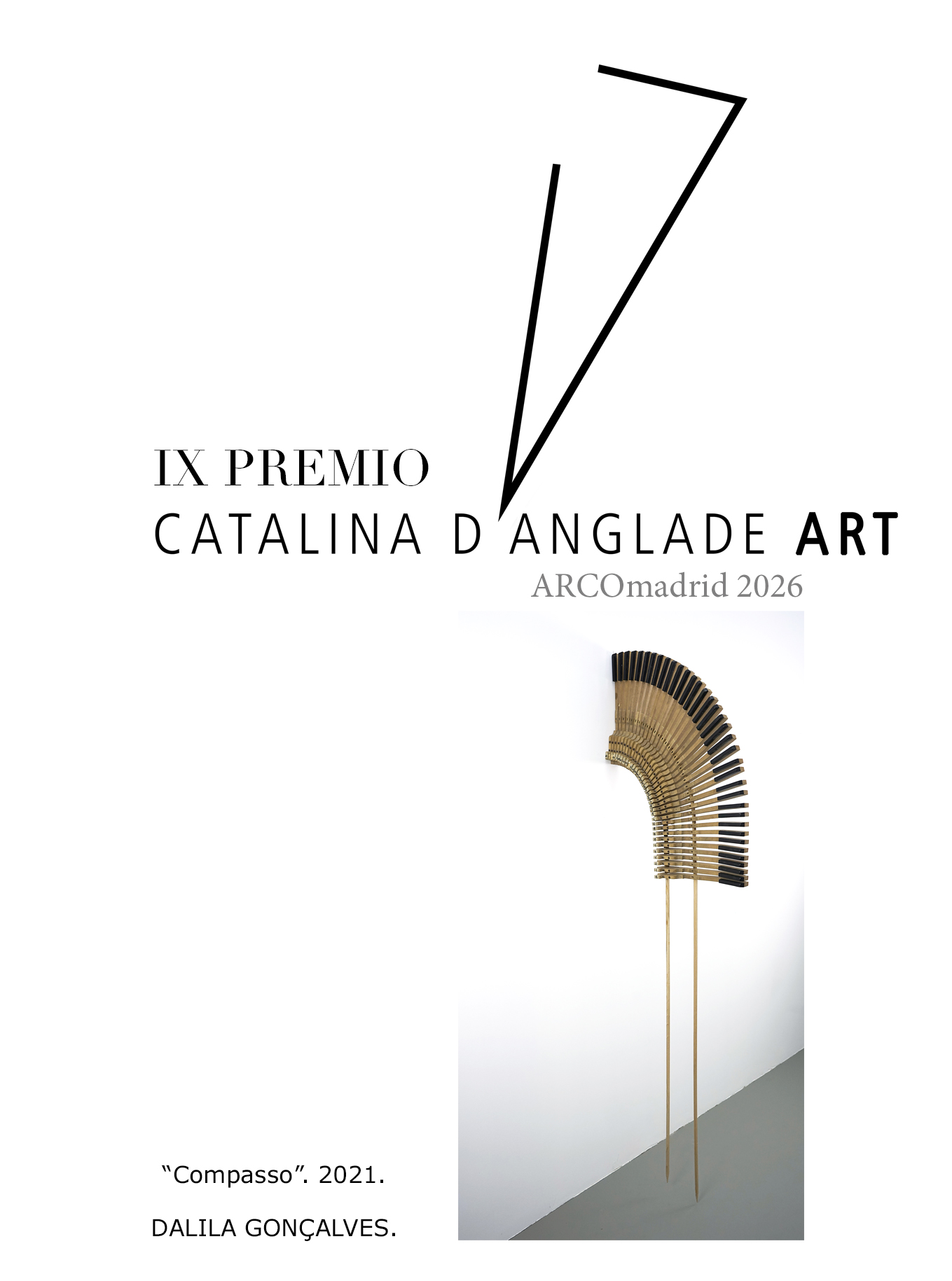 El miércoles 4 de marzo de 2026 tuvo lugar en ARCOmadrid la IX edición del Premio de Arte Catalina D’Anglade con la presencia de la directora de la feria, Maribel López. El galardón suma un año más como uno de los proyectos de apoyo al arte más innovadores del panorama artístico español. La artista portuguesa, Dalila Gonçalves (Castelo de Paiva, 1982) ha sido la ganadora de esta edición con su escultura Compasso (2021), compuesta por teclas de un antiguo piano procedentes de un taller tradicional de restauración que nos sugieren expansión y movimiento. En palabras de Gonçalves, la obra explora “la relación entre tiempo y espacio a partir de la doble lectura de esta palabra: el compás como instrumento de dibujo, que mide y estructura el espacio, y el compás musical, que organiza el tiempo y sostiene el ritmo”.
